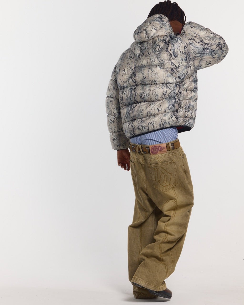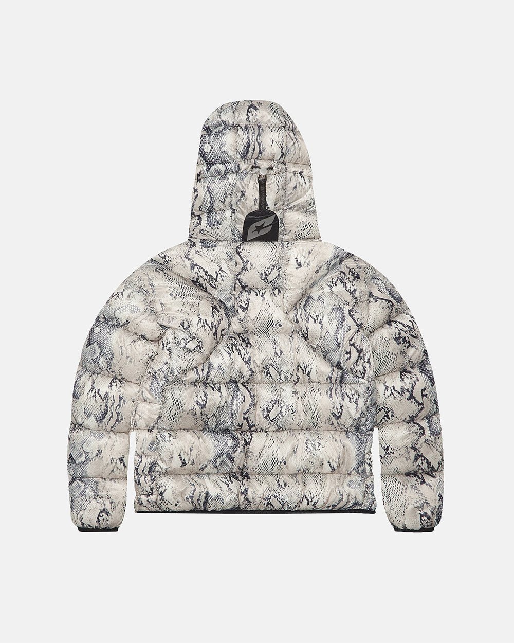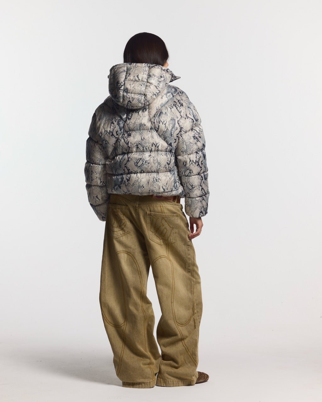 Puffer jacket with multiple panels.