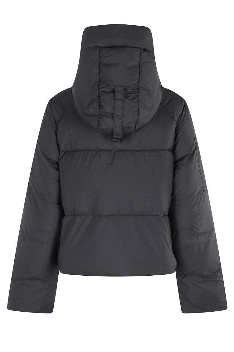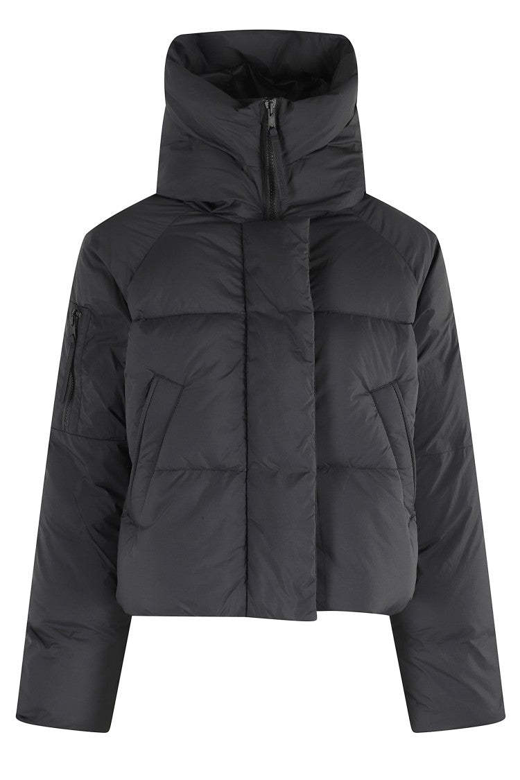 Chilliwack Down Jacket by Canada Goose exemplifies luxury outerwear with its high padded collar and concealed front zipper, seamlessly blending functionality with contemporary style. Crafted from 100% premium polyester, this cropped puffer showcases a boxy silhouette and features horizontal quilting for added warmth. A zippered pocket on the arm adds a practical element to this chic piece, ideal for urban adventures or casual outings.