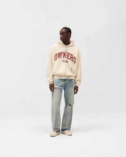 Introducing the Represent Owners Club Zip Through Hoodie in Buttercream, designed as part of the next era of Owners Club. Crafted from 380GSM heavyweight cotton with a brushed interior and carbon finish, it delivers a soft, vintage feel while maintaining its structure. The hoodie features an oversized, boxy fit with a drawn-in waistband, double layer hood, and minimal stitching for a relaxed, slouched drape. A double-ended central zip brings versatility, while the kangaroo pocket is finished with a Represent metal bar. Detailed with a soft water-based Owners Club graphic to the chest in deep red tones.