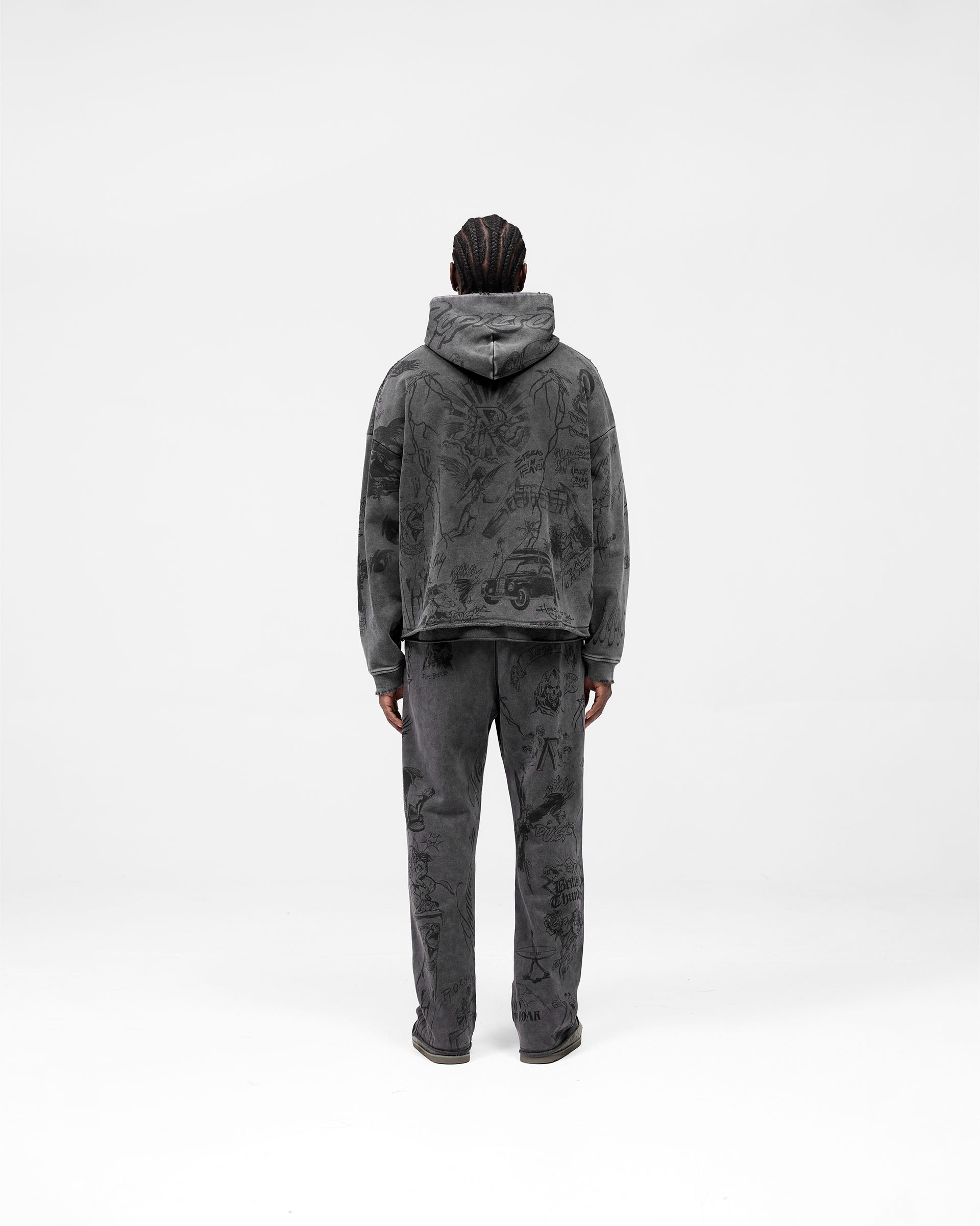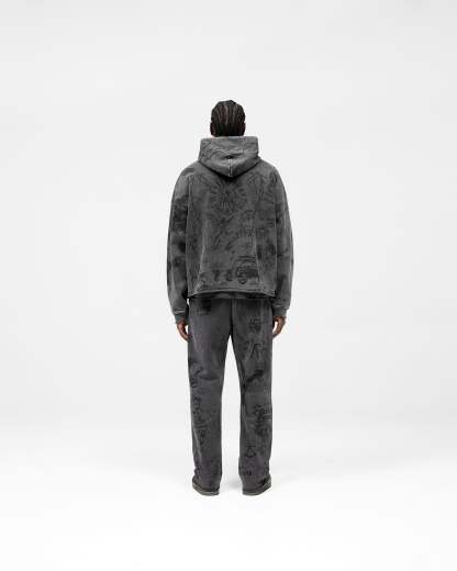 Introducing the Legacy Hoodie in Vintage Grey, a statement silhouette crafted from the Represent sketchbook archives. Crafted from heavyweight 480GSM loopback cotton and finished with a silicone wash and pigment spray, this hoodie serves as a tribute to 14 years of Represent design. A more tonal version of the graphic print, the graphics being darker than the wash.