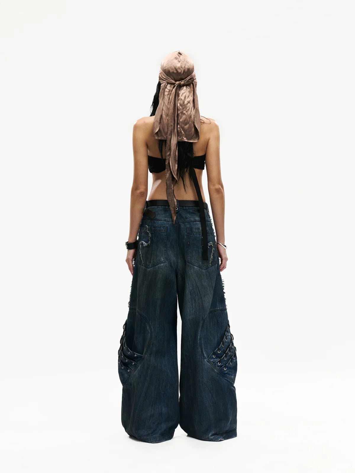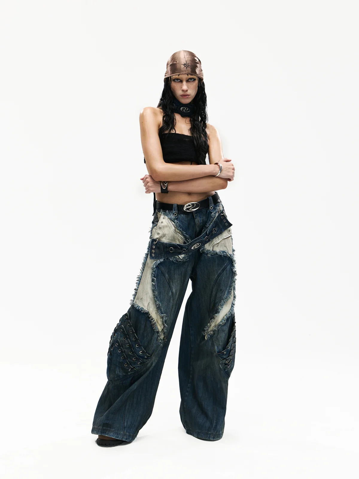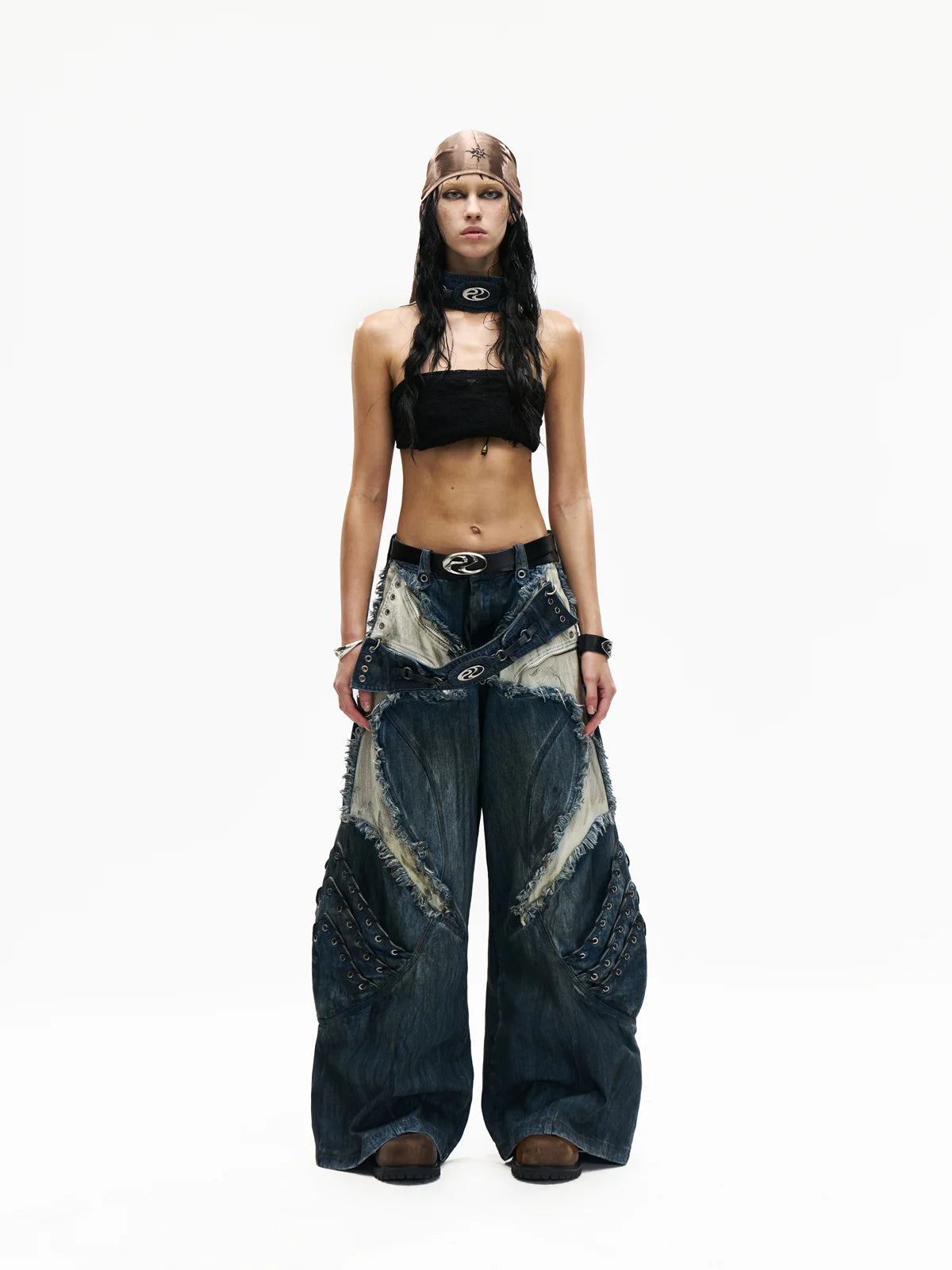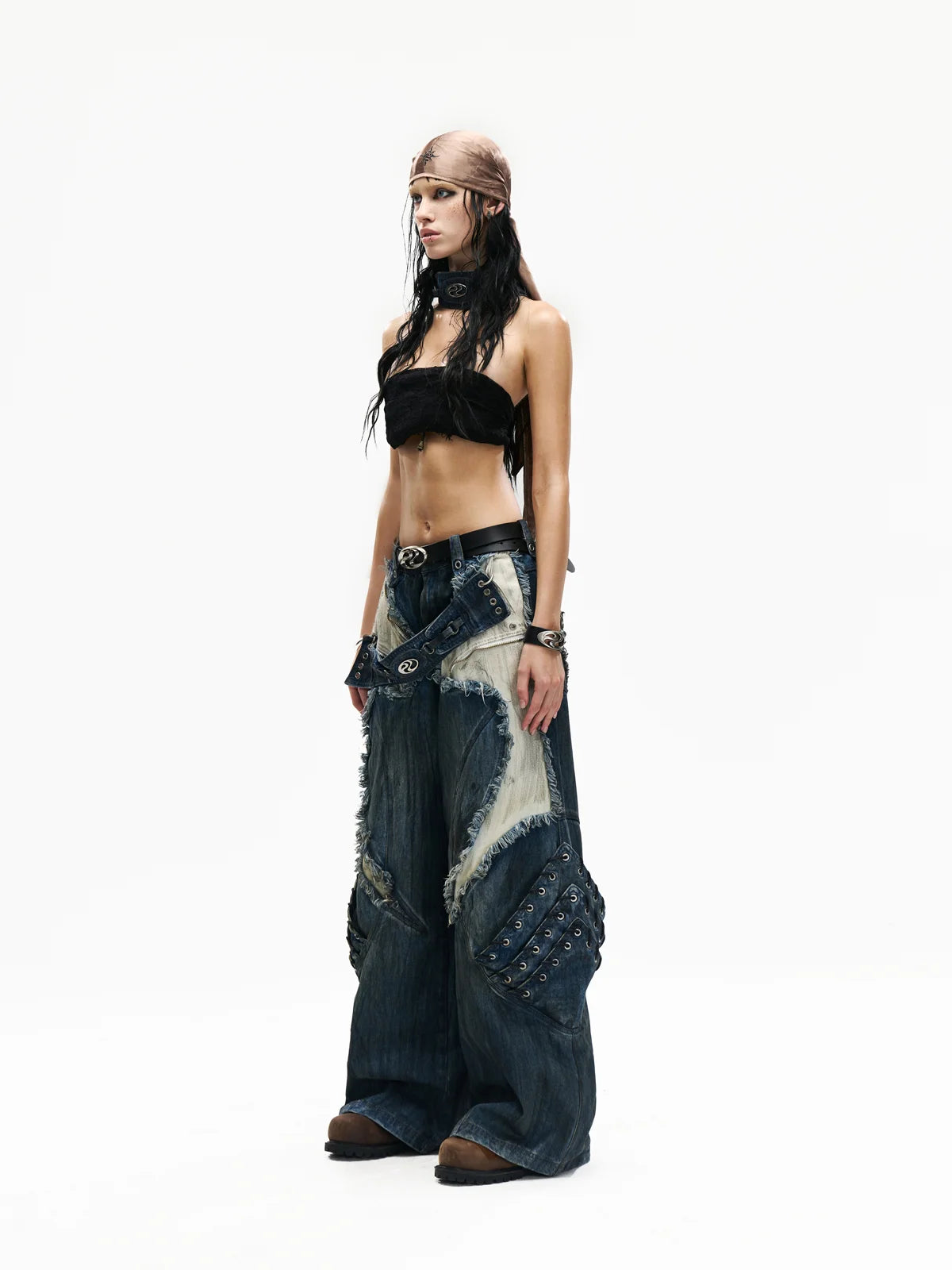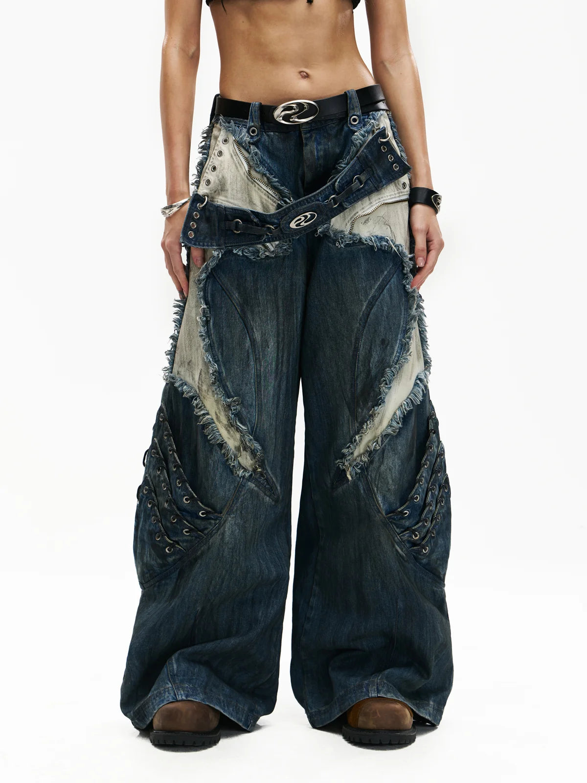 • A-Line Loose Fit.• Unisex.• 100% Cotton.• Blue And White Denim Color-Blocking.• Armor Elements Are Designed At The Knees.• Tone-On-Tone Belt At Waist.