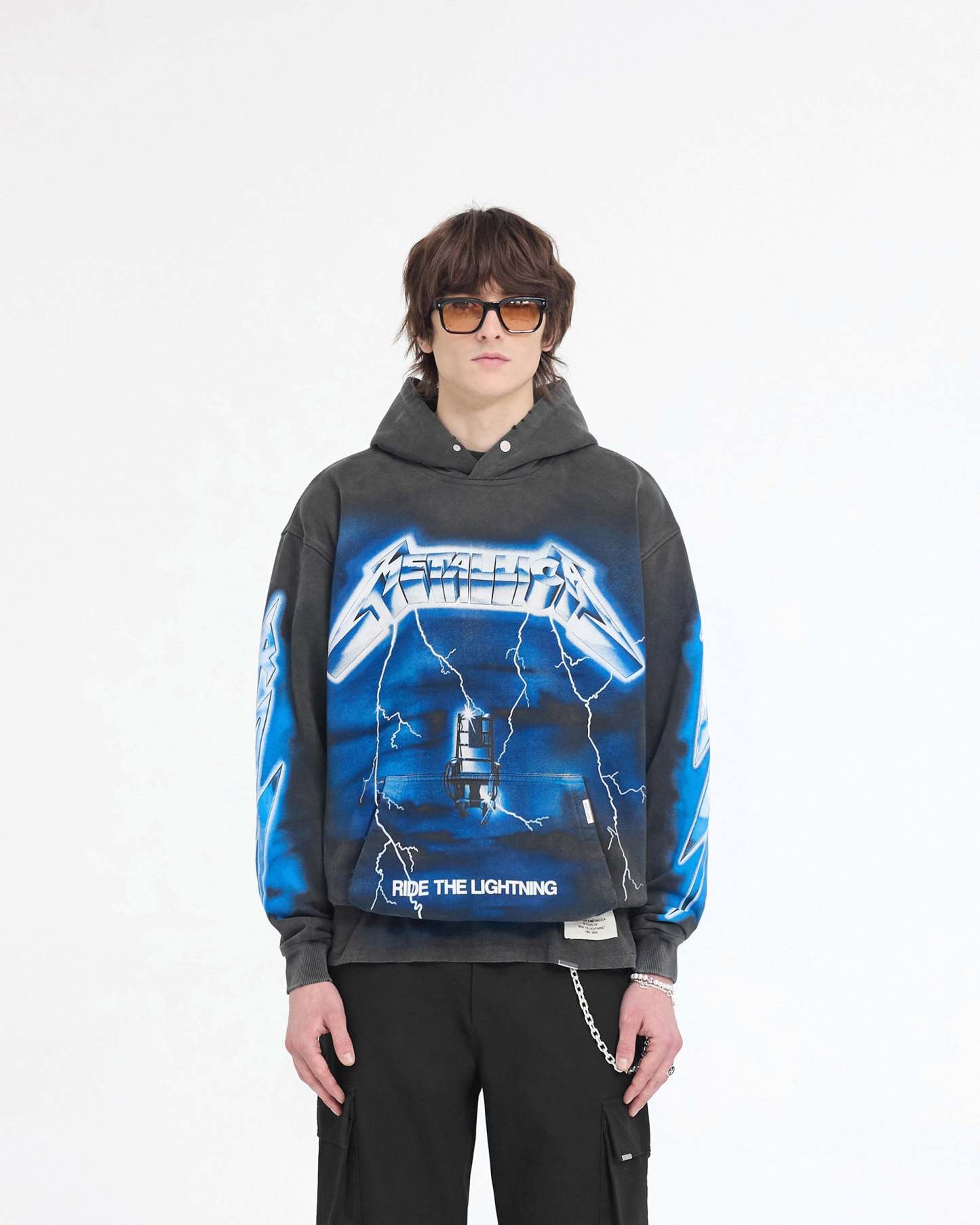 Introducing the Metallica Ride the Lightning Hoodie in Vintage Grey. This hoodie has a full front and back jumbo print application, with initialised lightning to the sleeves. The back print features a hand painted Represent logo paying homage to the analogue techniques of the ‘80s.