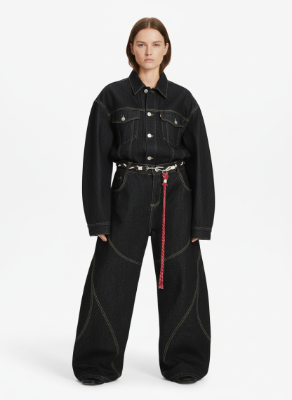 • Design Elements: Braided belt with red accents, wide-leg silhouette, side pockets