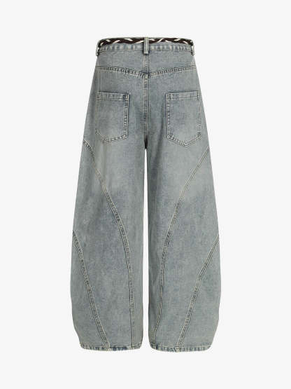 Denim Retro Belt Detail With Patchwork Barrel Jeans - 2490