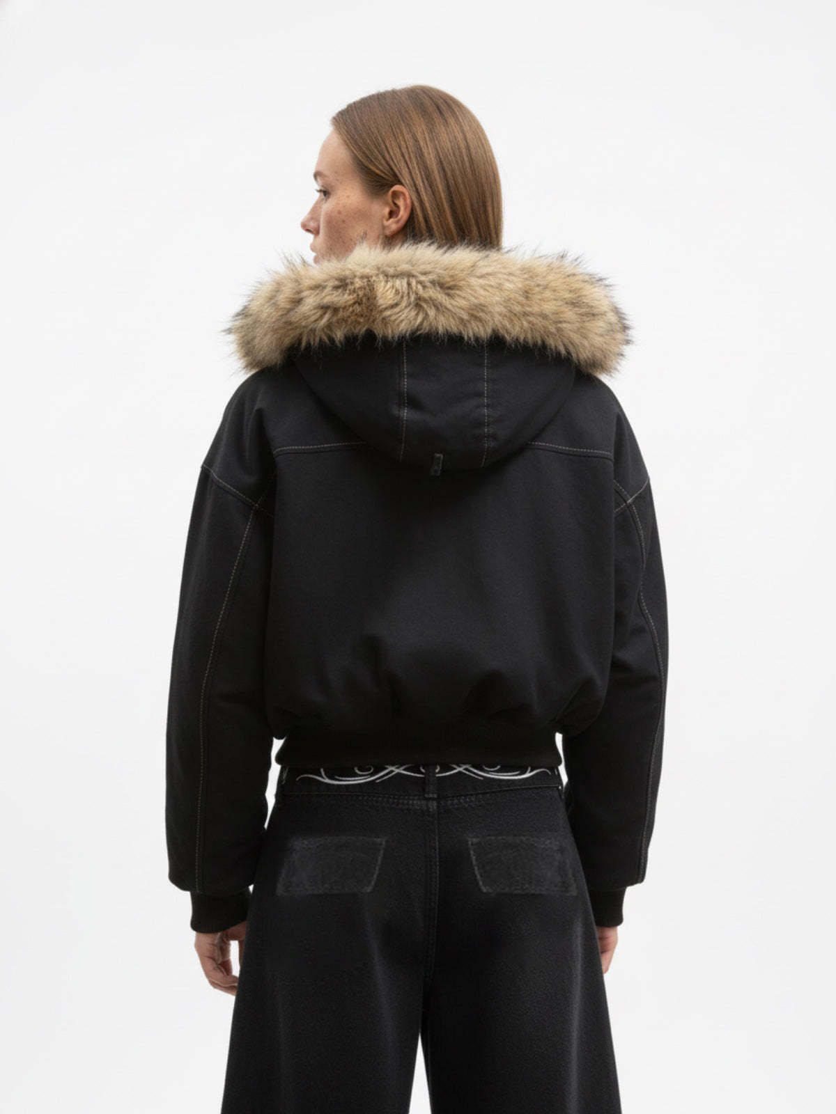 Faux Fur Lined Zip Up Hooded Bomber Jacket