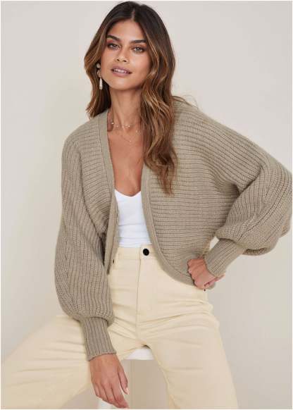 Cozy and chic? Say less – this cardigan is a closet must-have. The open front and balloon style sleeves make it easy to toss this shrug over any top, while the tight fabric at the wrist keeps everything in place. Add in some soft knit fabric and voila! You’ve got everything you need for the perfect transitional layering piece. * Open front * Balloon sleeves* Acrylic/polyester/nylon. Imported