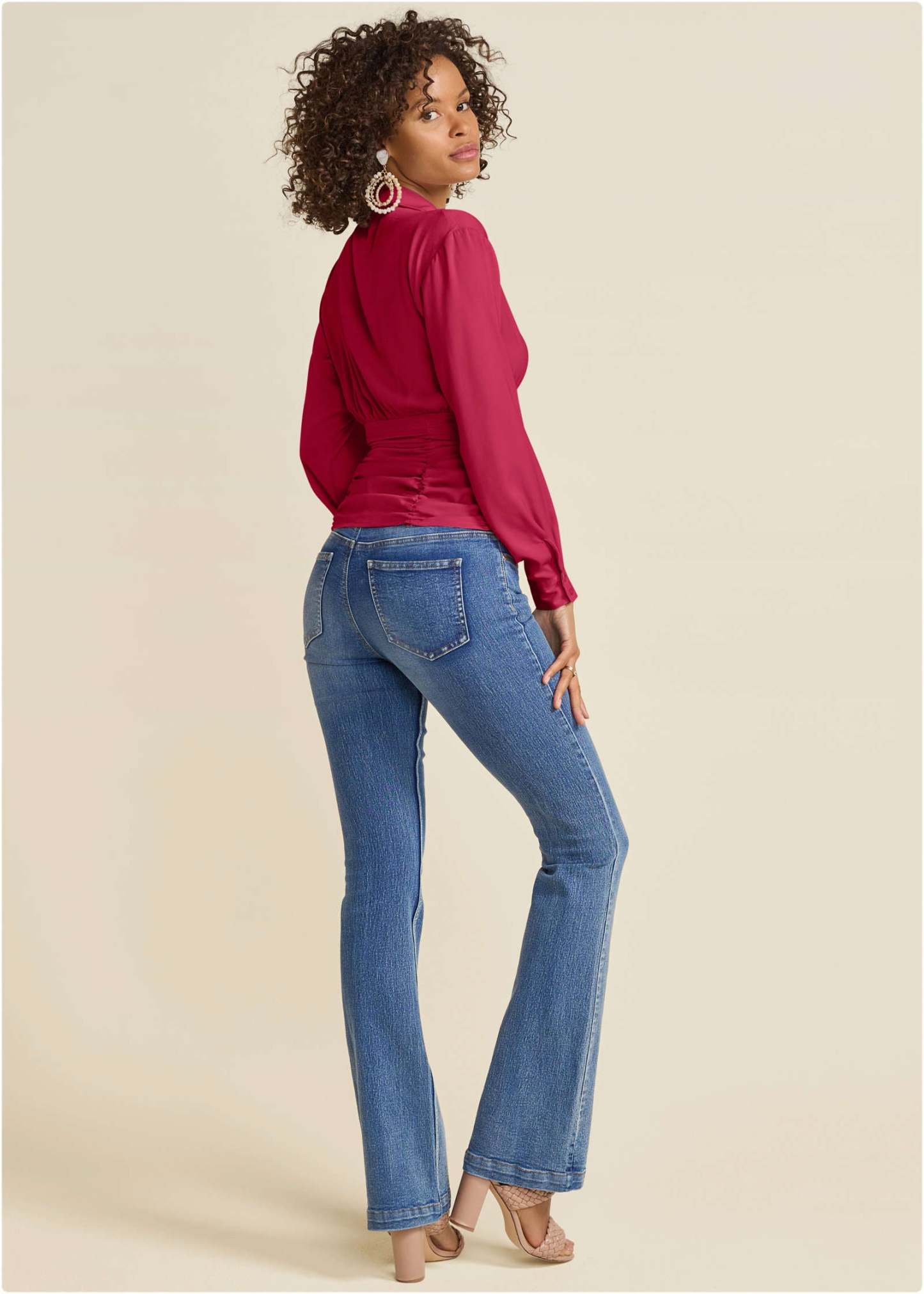 Meet your new go-to blouse—polished, flattering, and ready for anything. The structured collared neckline keeps it sleek, while the ruched waist hugs your curves in all the right places. With long sleeves for a touch of sophistication, this top effortlessly transitions from office hours to after-hours. Pair it with tailored pants and a blazer for work or switch to denim and heels for a date-night glow-up.* FLATTERING RUCHED WAIST: Designed to cinch and sculpt, highlighting your shape while keeping it comfortable.* Sizes: XS (2), S (4-6), M (8-10), L (12-14), XL (16)* Plus sizes: 1X (18-20), 2X (22-24), 3X (26-28)* CLASSIC WITH A TWIST: A sharp collared neckline meets a figure-enhancing fit for the perfect balance of structured and sultry.* VERSATILE STYLE: Sleek enough for the office, chic enough for cocktails—just swap your bottoms and go.* ELEVATED ESSENTIAL: Pairs seamlessly with black pants for work or denim and heels for an effortless date-night look.* Poly. Imported