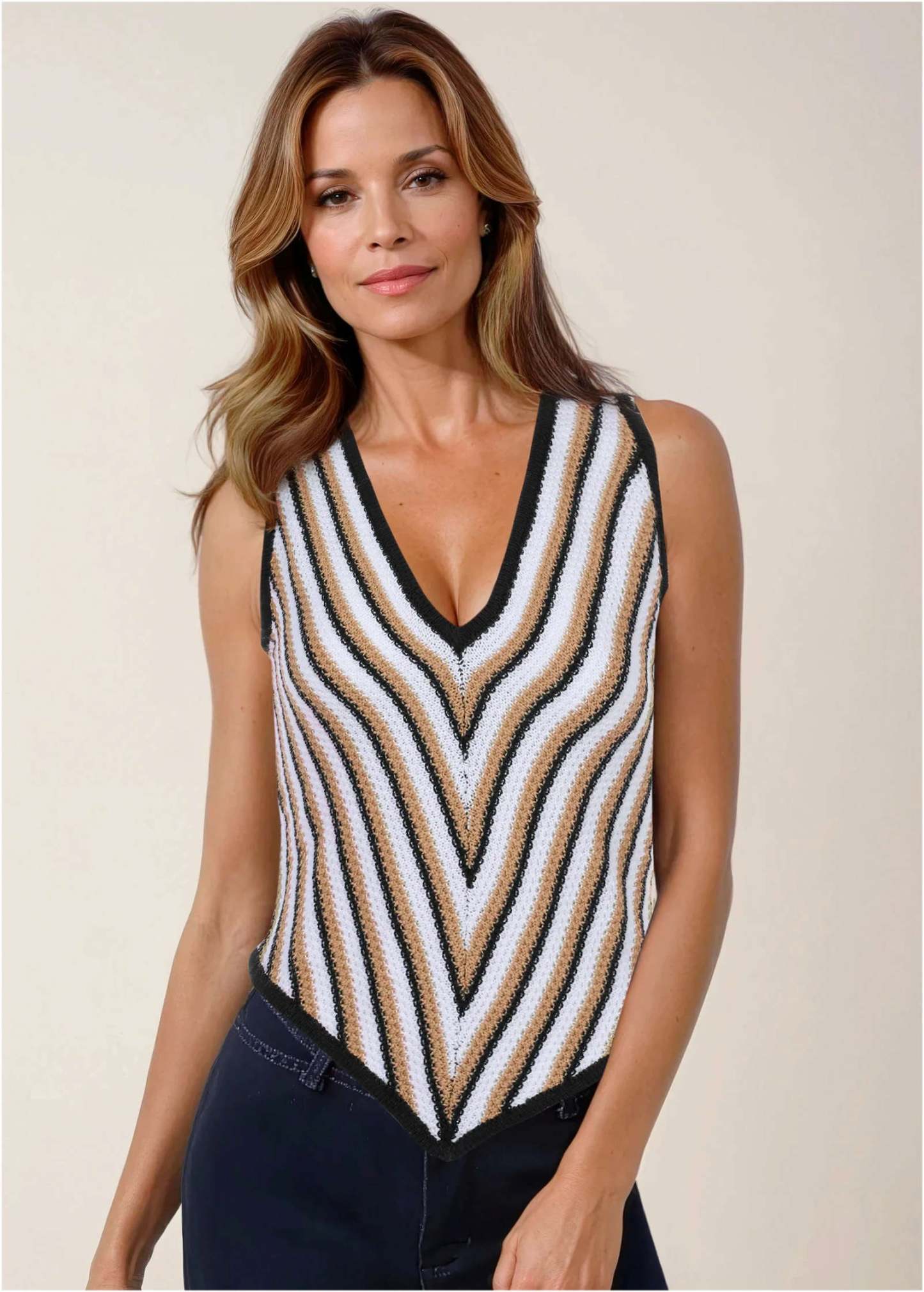 The Stripe Tank Top is made for sunny days, chilly nights and easy layering. With a flattering V-neckline, breezy knit fabric, and a flowy V hem, this sleeveless style keeps things light, airy, and chic. Pair it with your best skinny jeans or black pants for a look that works from brunch to vacation.* Sizes: XS (2), S (4-6), M (8-10), L (12-14), XL (16)* V-neckline: Flattering and feminine* Sleeveless: Perfect for warm days* Breezy knit: Lightweight and comfy* V hem: Adds shape and movement* Cotton/acrylic. Imported