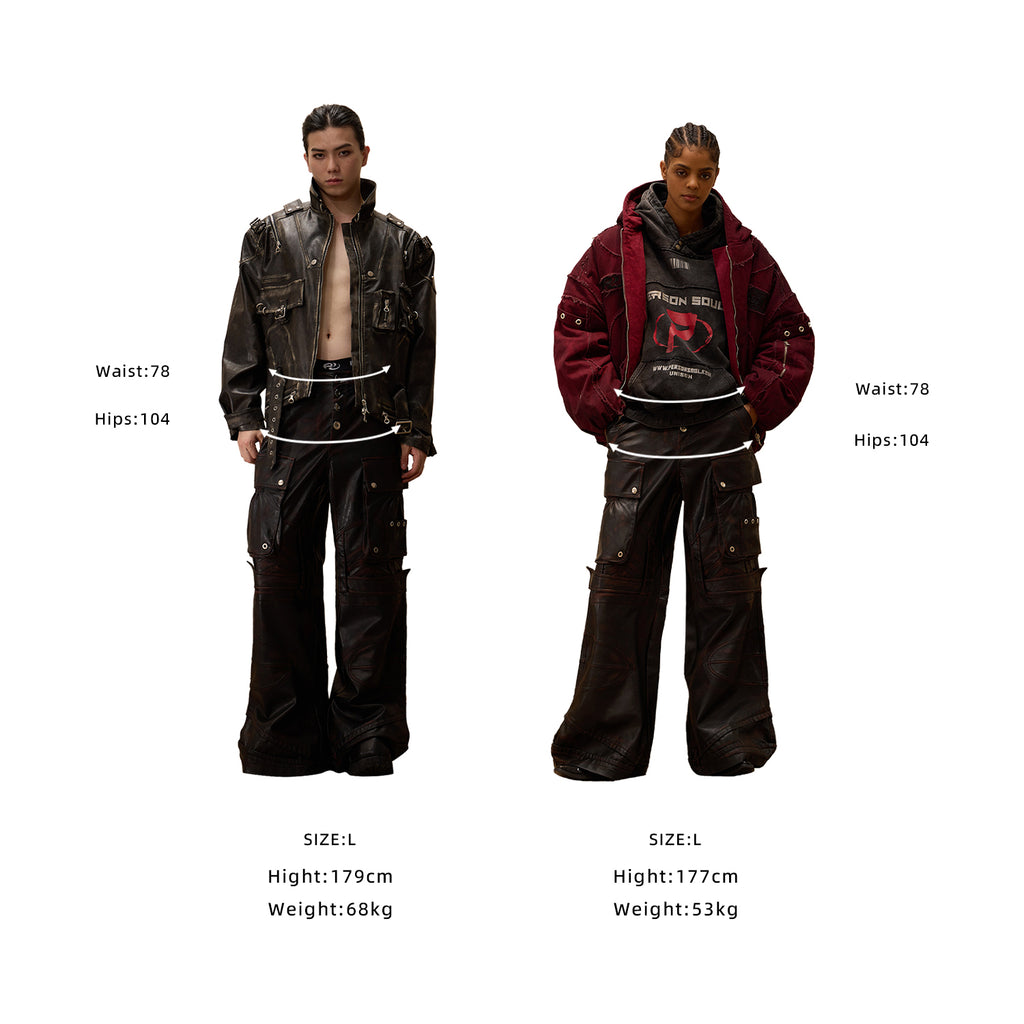 • Standard Fit. • Faux Leather. • Unisex. • Buttons-Fly. • Multi Pockets. • Paneled Construction.• Hand Brushed.
